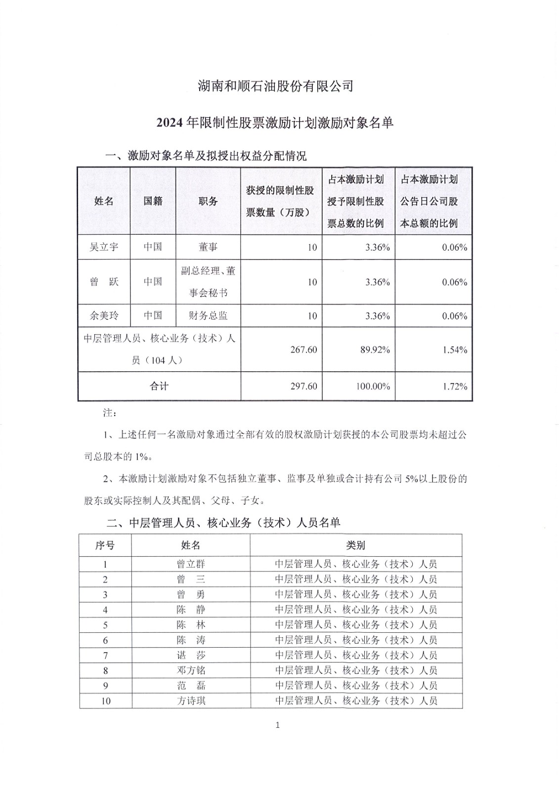 湖南和順石油股份有限公司(以下簡稱“公司”)于2024年4月25日召開第三屆董事會(huì)第九次會(huì)議和第三屆監(jiān)事會(huì)第八次會(huì)議,審議并通過《關(guān)于公司<2024年限制性股票激勵(lì)計(jì)劃(草案)>及摘要的議案》等相關(guān)議案。根據(jù)中國證券監(jiān)督管理委員會(huì)《上市公司股權(quán)激勵(lì)管理辦法》的有關(guān)規(guī)定,公司對2024年限制性股票激勵(lì)計(jì)劃激勵(lì)對象的姓名和職務(wù)進(jìn)行如下公示,公示期為2024年4月30日至2024年5月9日,共10天。在公示期間,對公示對象有異議的,可經(jīng)書面郵件形式向公司監(jiān)事會(huì)反映,接收郵箱為:pengmujun@hnhsjt.com。