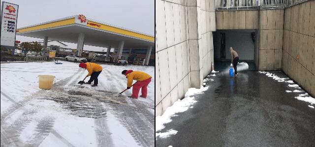 寒風(fēng)中,油庫一線員工為維護(hù)正常卸、發(fā)油而冒雪工作,檢查設(shè)施設(shè)備狀態(tài);物流車隊(duì)司機(jī)們風(fēng)雪無阻,排除困難,按時(shí)按點(diǎn)將油品安全送達(dá)客戶、送到各站點(diǎn);各個(gè)加油站基層員工通力合作,掃除油站積雪,保障油站進(jìn)出通道順暢通行和行車安全;總部行政、物業(yè)人員也及時(shí)給辦公樓前坪進(jìn)行掃雪、除冰,為行政辦公工作保駕護(hù)航。